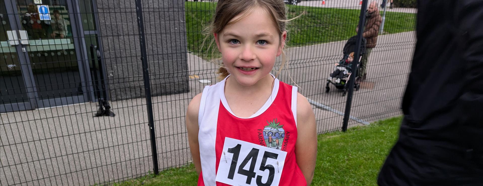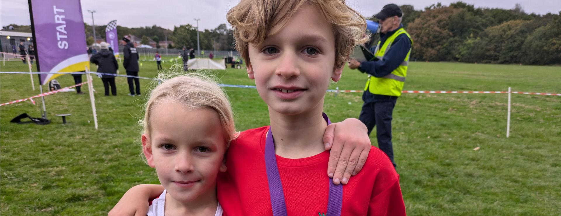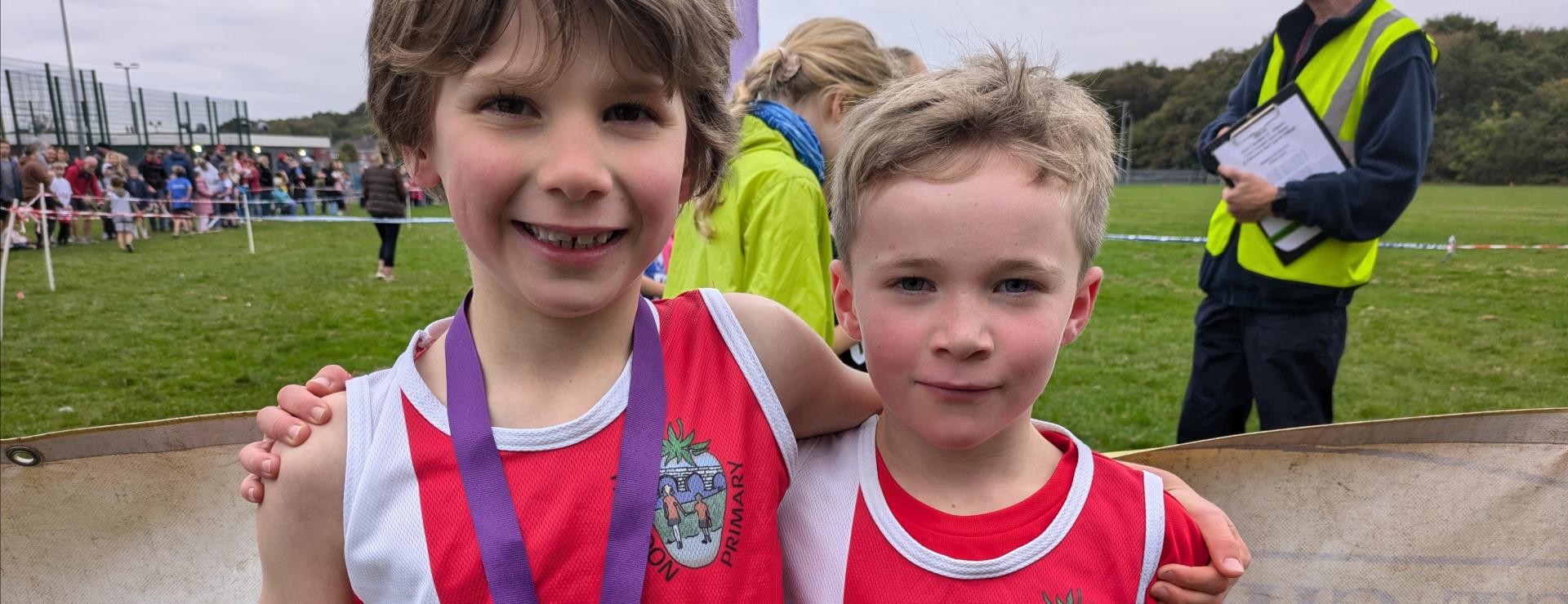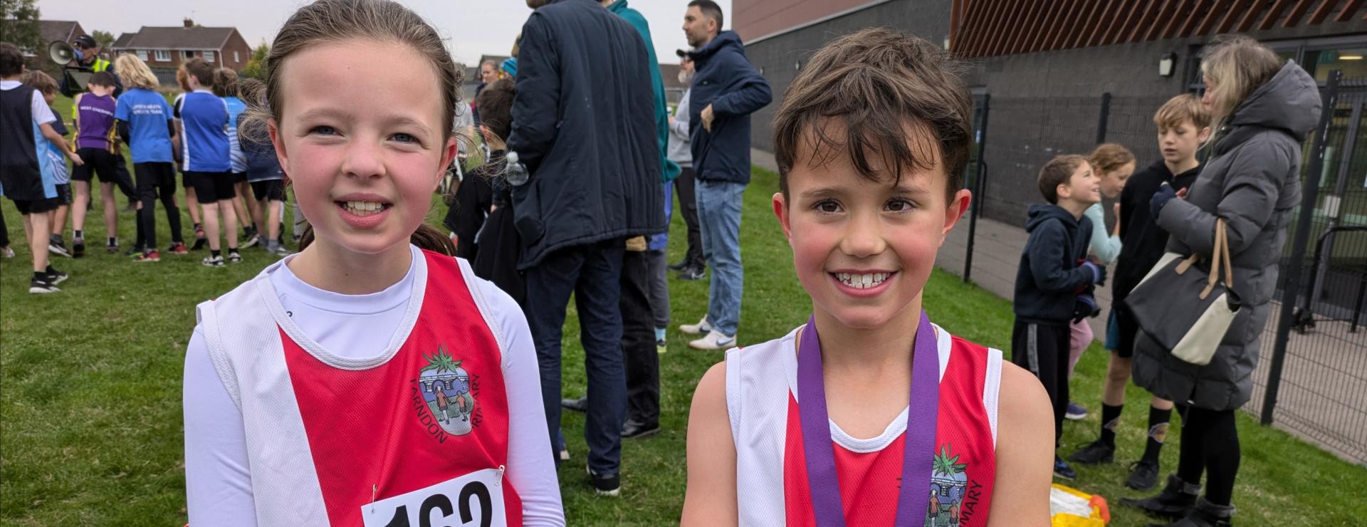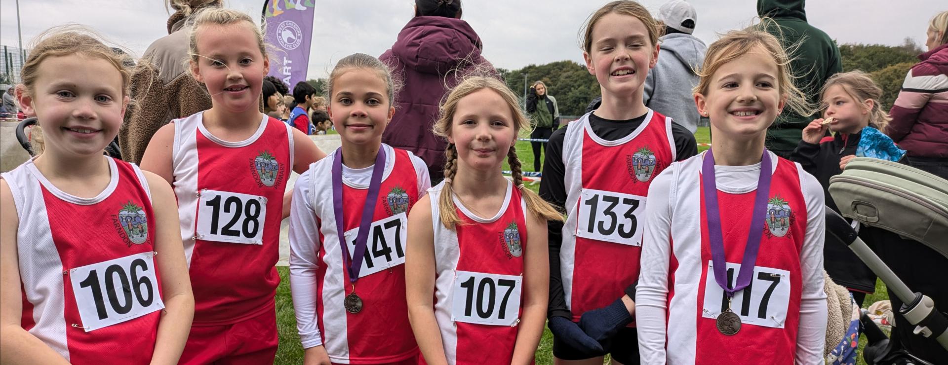 We had a large group of Year 4 pupils. For the girls, Jessica once again won silver, adding to the medals she won last year. Her close friend Hattie looked certain to finish in 4th, but she had other ideas! In the finishing straight it was hammer time! She ran down the girl in front of her and dipped for the line to win a bronze medal. It was a fantastic race for Farndon as Anna also came in 6th, Eva finished 8th and Scarlett 9th and Lilly also finished just outside the top 10; a team gold is very much on. Marcus and Dash were our runners for the boys. Marcus showed periods of real pace and ran well to finish. Dash had been training hard in the week before the race and he was determined to come back with a medal. On the run in, he was being caught, but Dash had enough left in the tank for a final burst to win the bronze medal.